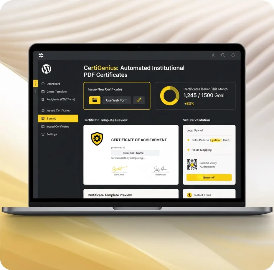 Certificados consistentes y confiables. Nuestro plugin asegura que cada PDF cumpla con tu branding y estándares. Mantén trazabilidad completa y verificación segura.